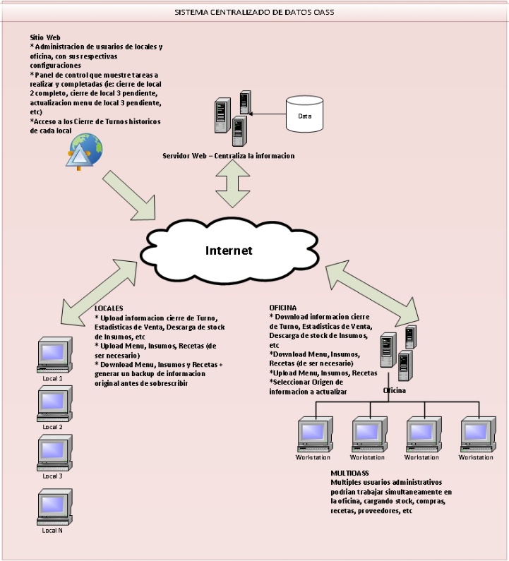 La instalación de los Sistemas OASS de cada Local en la Oficina Central y el Multi-OASS, así como el Programa de Centralización OASS se realizan por una única vez.El Programa de Centralización OASS también cuenta con un programa de Actualización automática, cuando fuere necesario. (toda corrección o actualización del Programa se realiza y se sube a Internet, para que el Programa de Centralización OASS de cada Local detecte que se actualizo el programa principal y lo copie a la CPU del Local, así queda operativo). Esta operación se realiza automáticamente al encender el equipo por la mañana o, si el equipo del Local permanece siempre encendido, se realiza manualmente con el botón derecho del mouse en el Programa de Centralización OASS en cualquier momento.